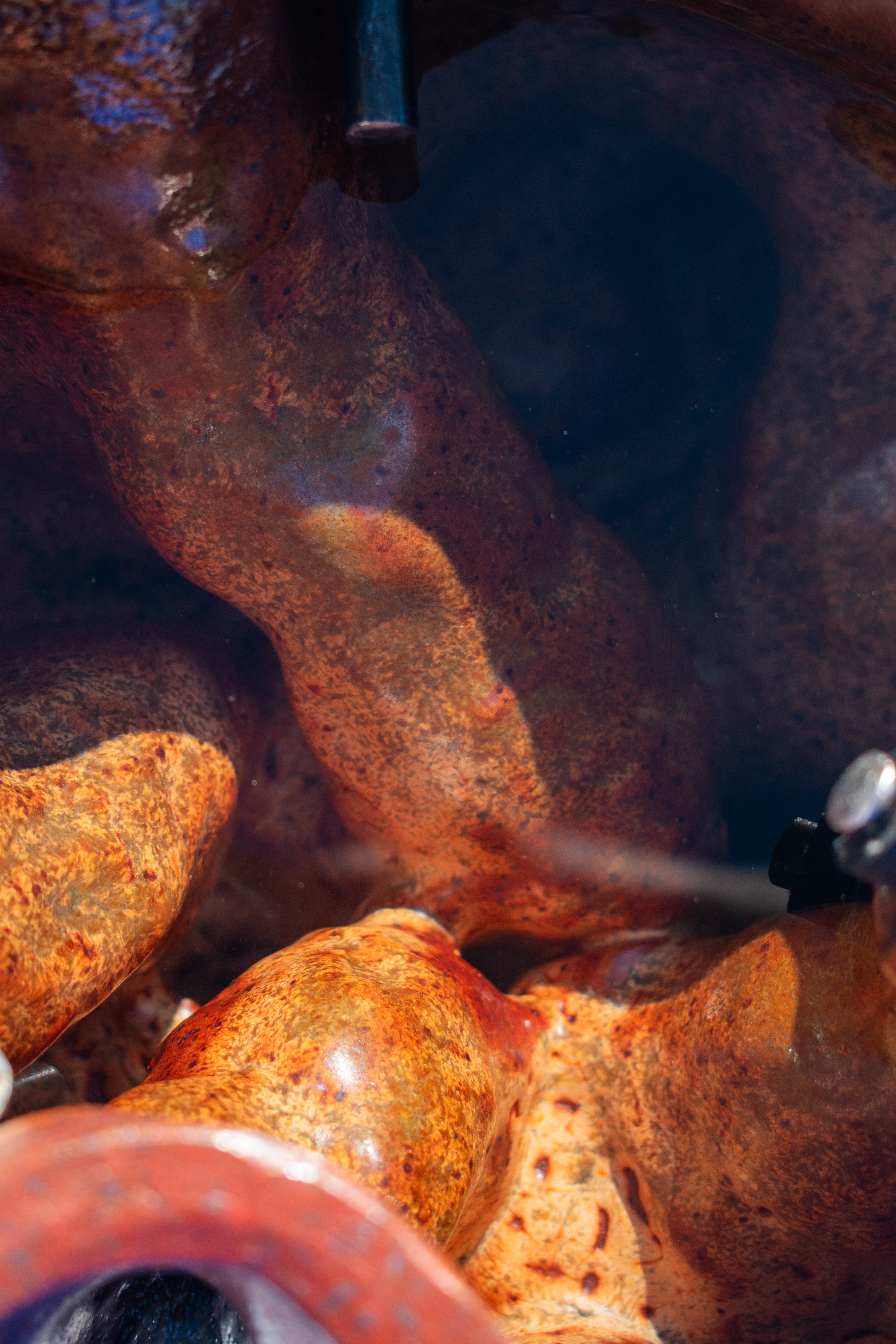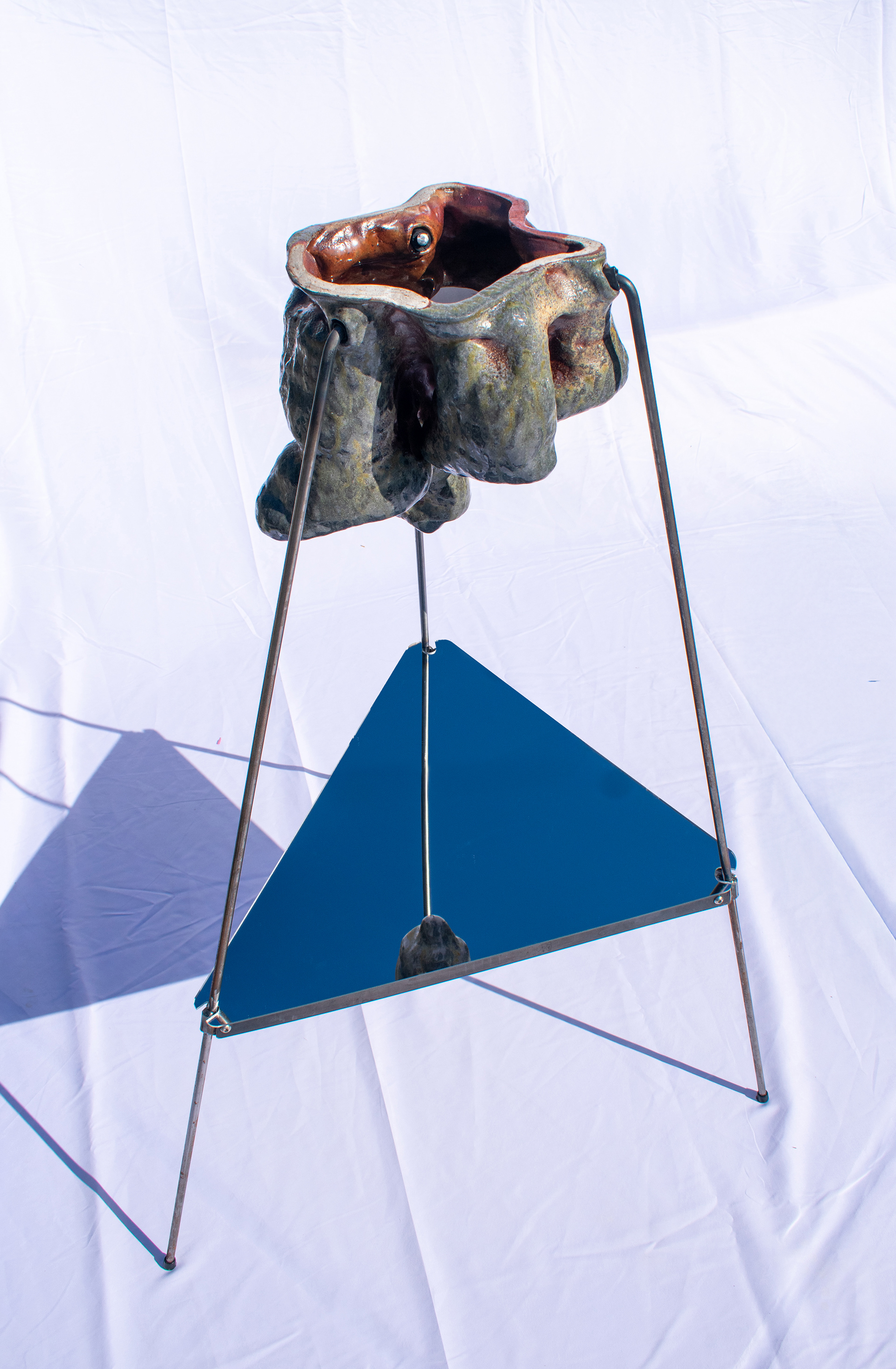 Glazed high-fire soda reduction stoneware, mild steel, vinyl tubing/caps, mirrored acrylic plexiglass, metal hardware, water. 2024. 32" x 30" x 46".