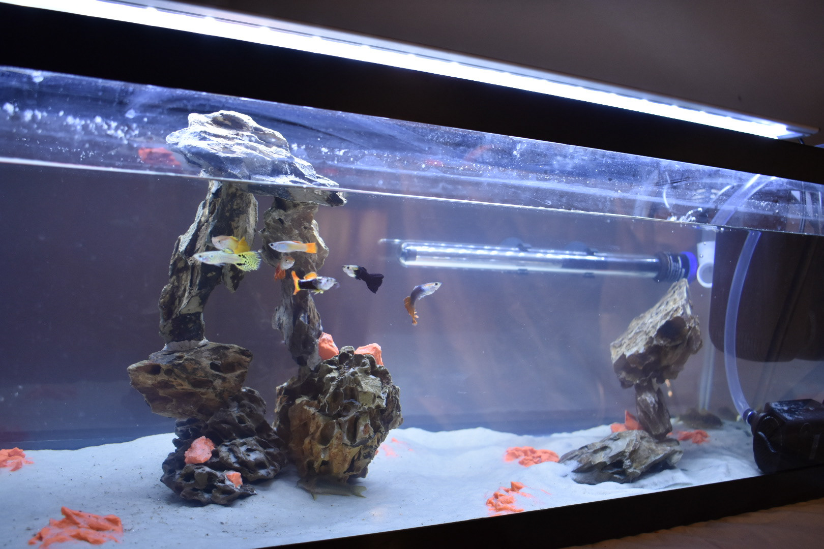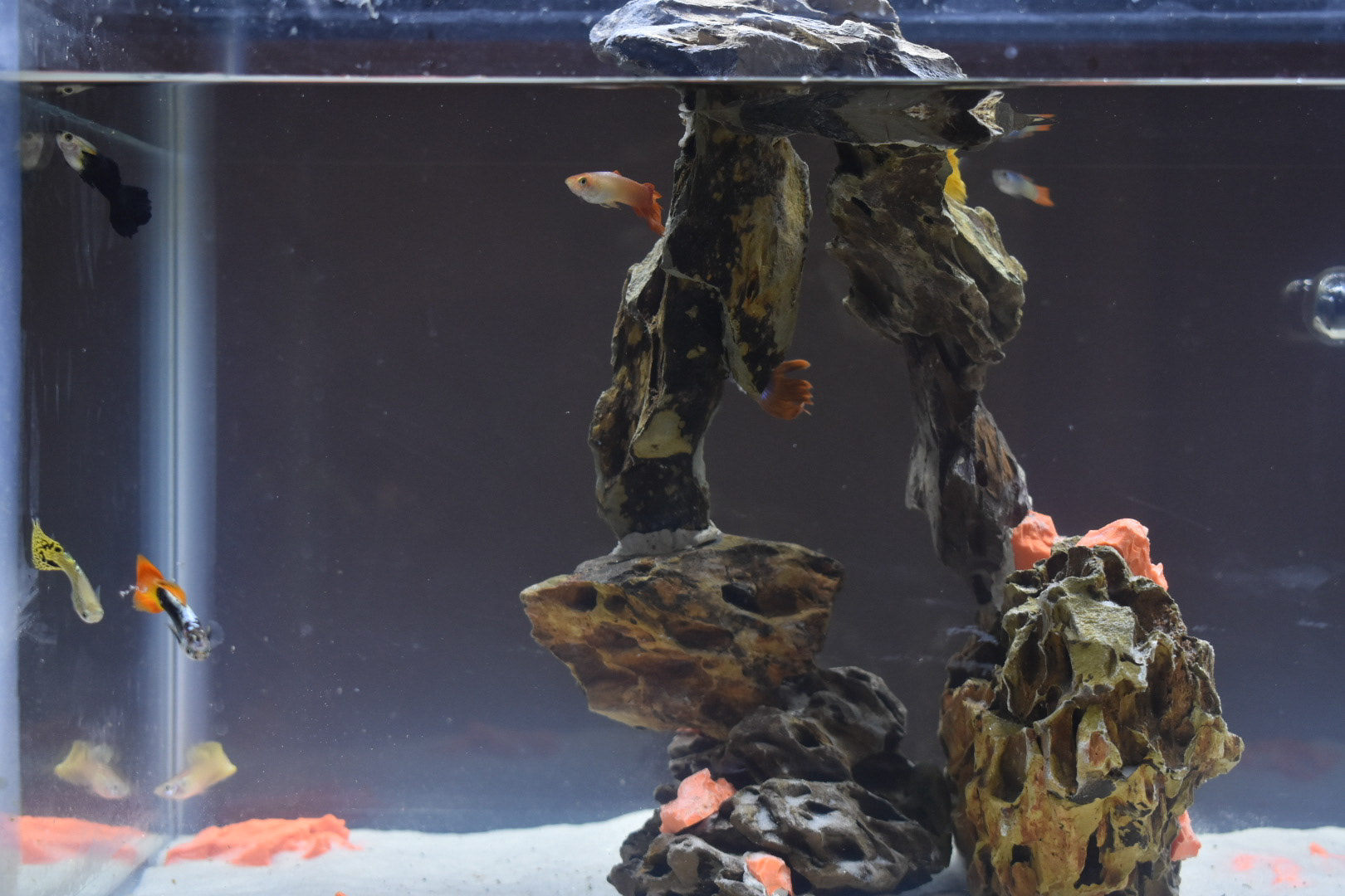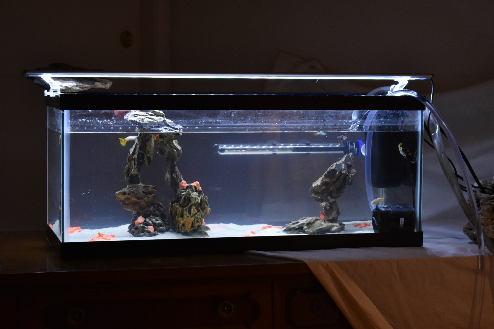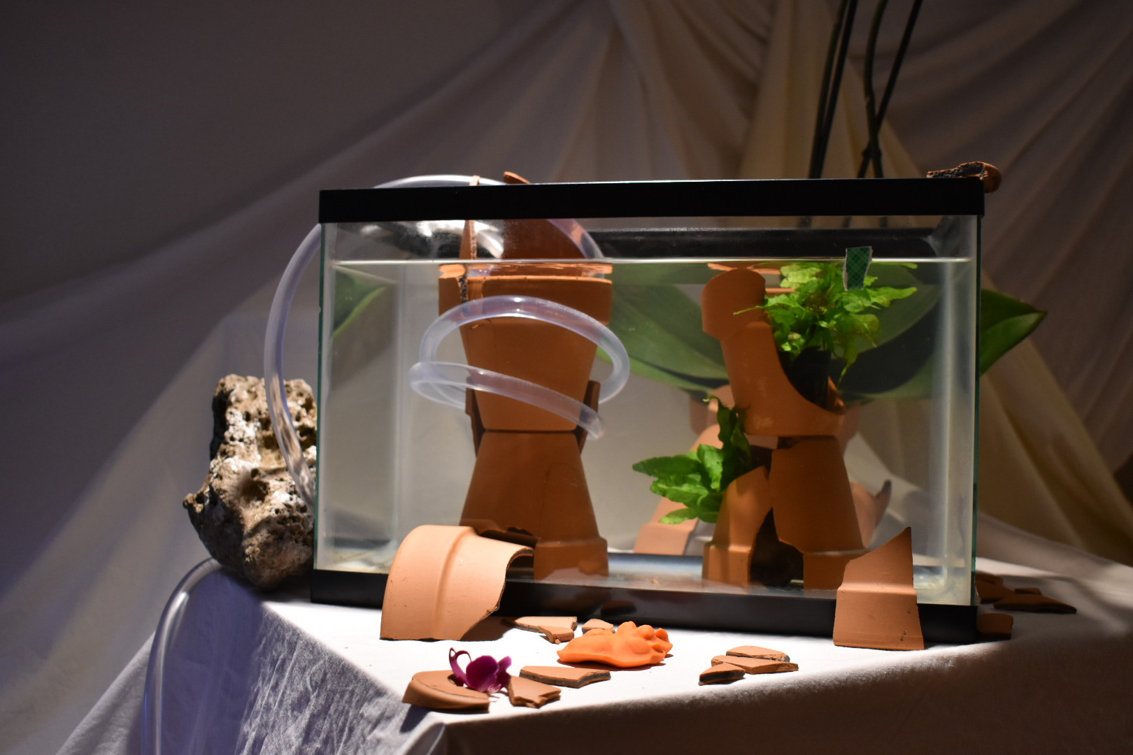Assorted freshwater guppies, live crickets, live Pomeranian dog, Java fern plants, white sheets, aquariums, mounted gelatin silver print, repurposed/painted wooden furniture, LED lights, Ohko stone, moon sand, terra-cotta pots, dried coral skeletons, clay, aquarium filter & heater, flex tubing, glass jar, flashlight, aluminum foil, laptop speaker. 2020. 15’ x 12’ x 10’.