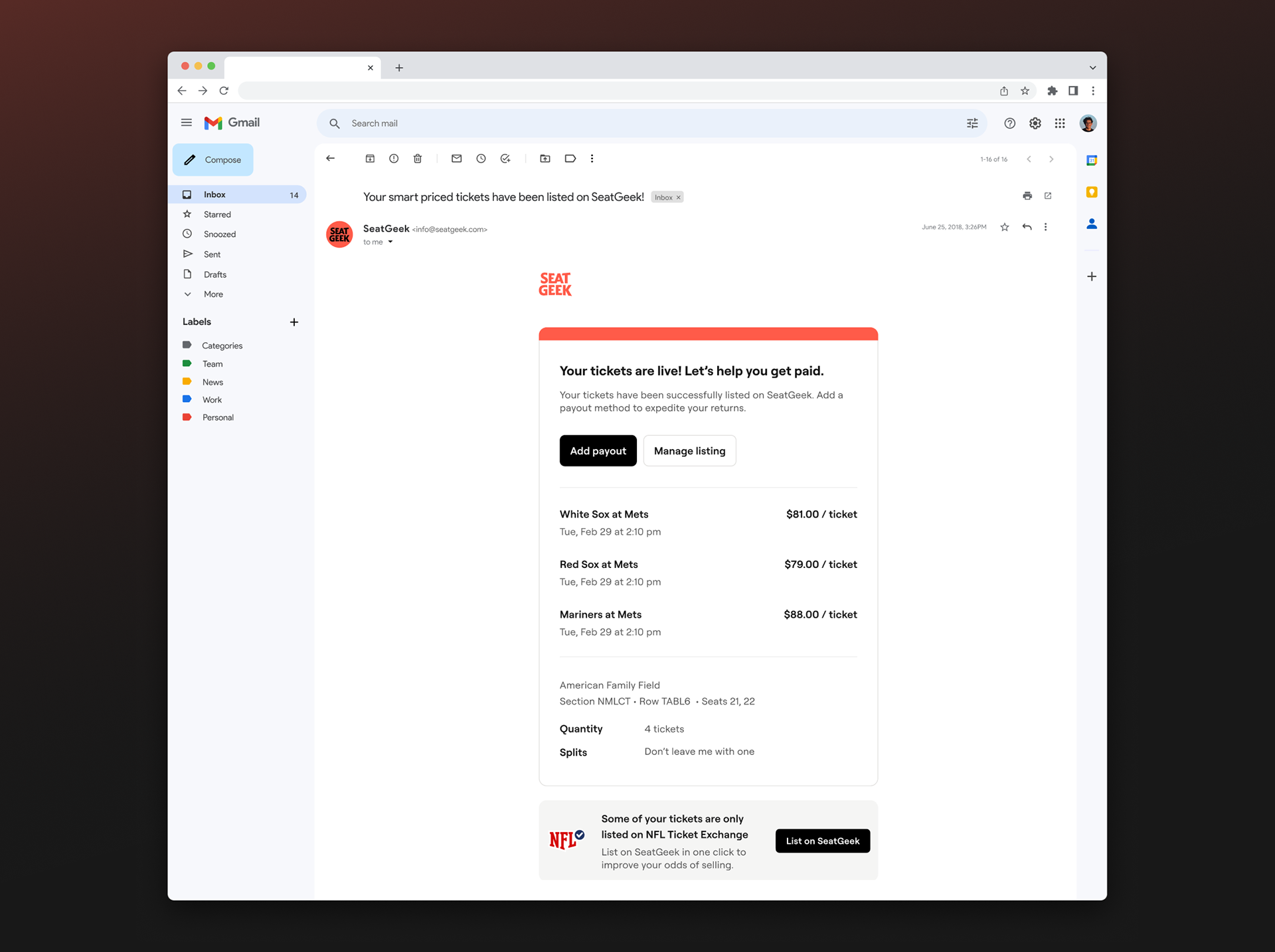 As a product designer at SeatGeek, I introduced a modular email template system generating millions of dynamic, AI-driven listing confirmation emails seen by thousands of fan sellers every day.