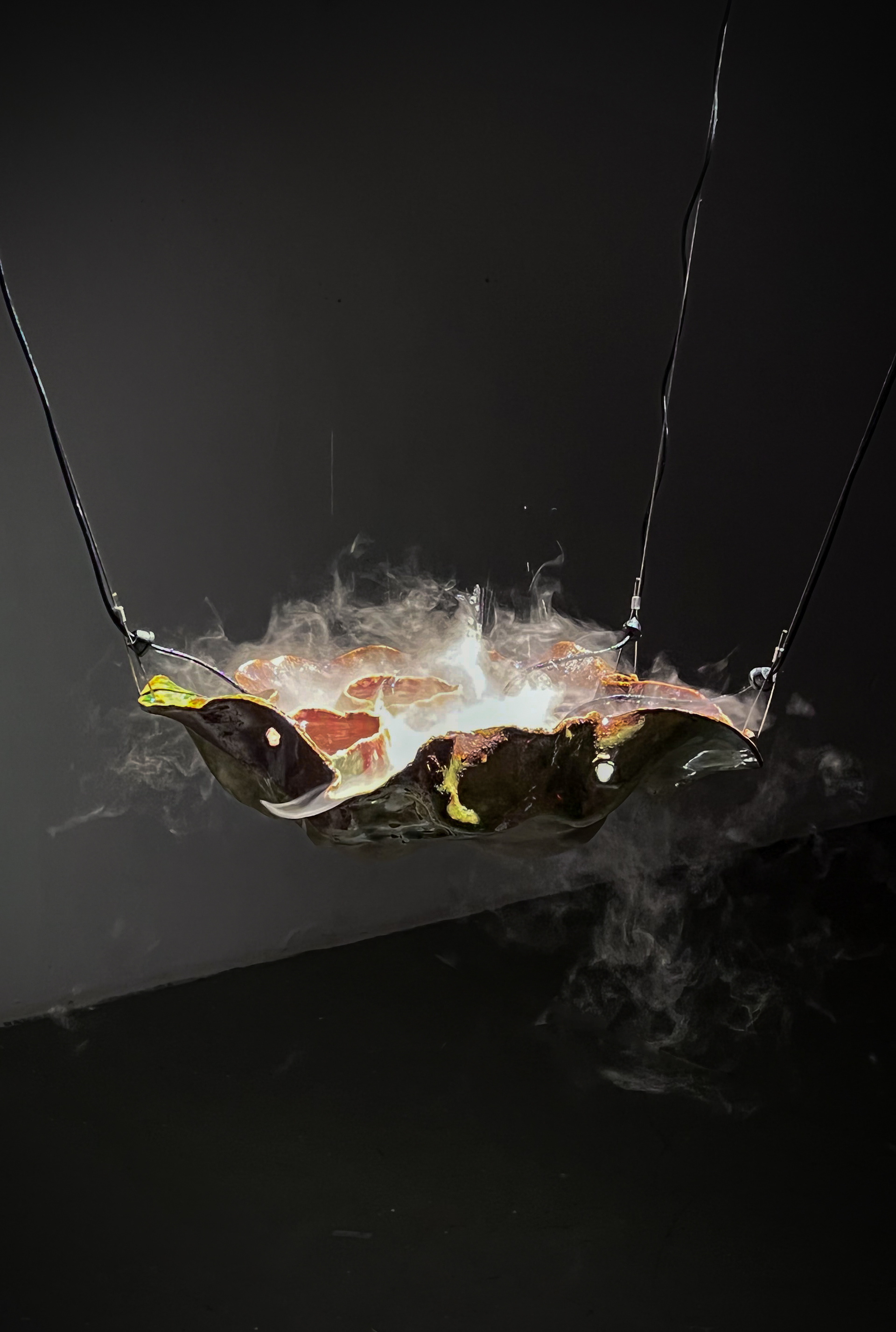 Glazed ceramic, water, aircraft wire, fogger devices. 2022. 18" x 18" x 4".